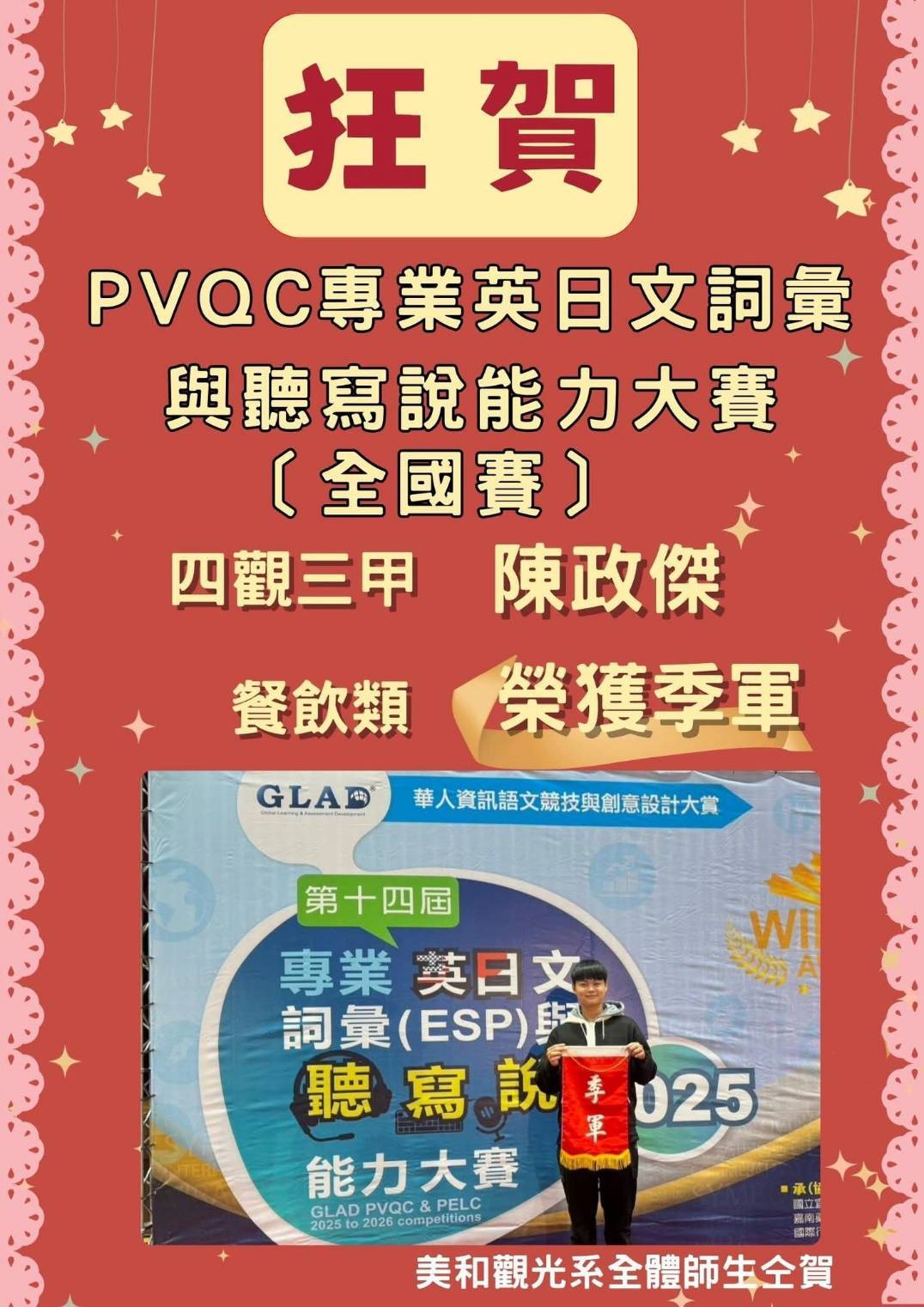 賀!四觀三甲陳政傑榮獲2025 PVQC全國賽餐飲類冠軍